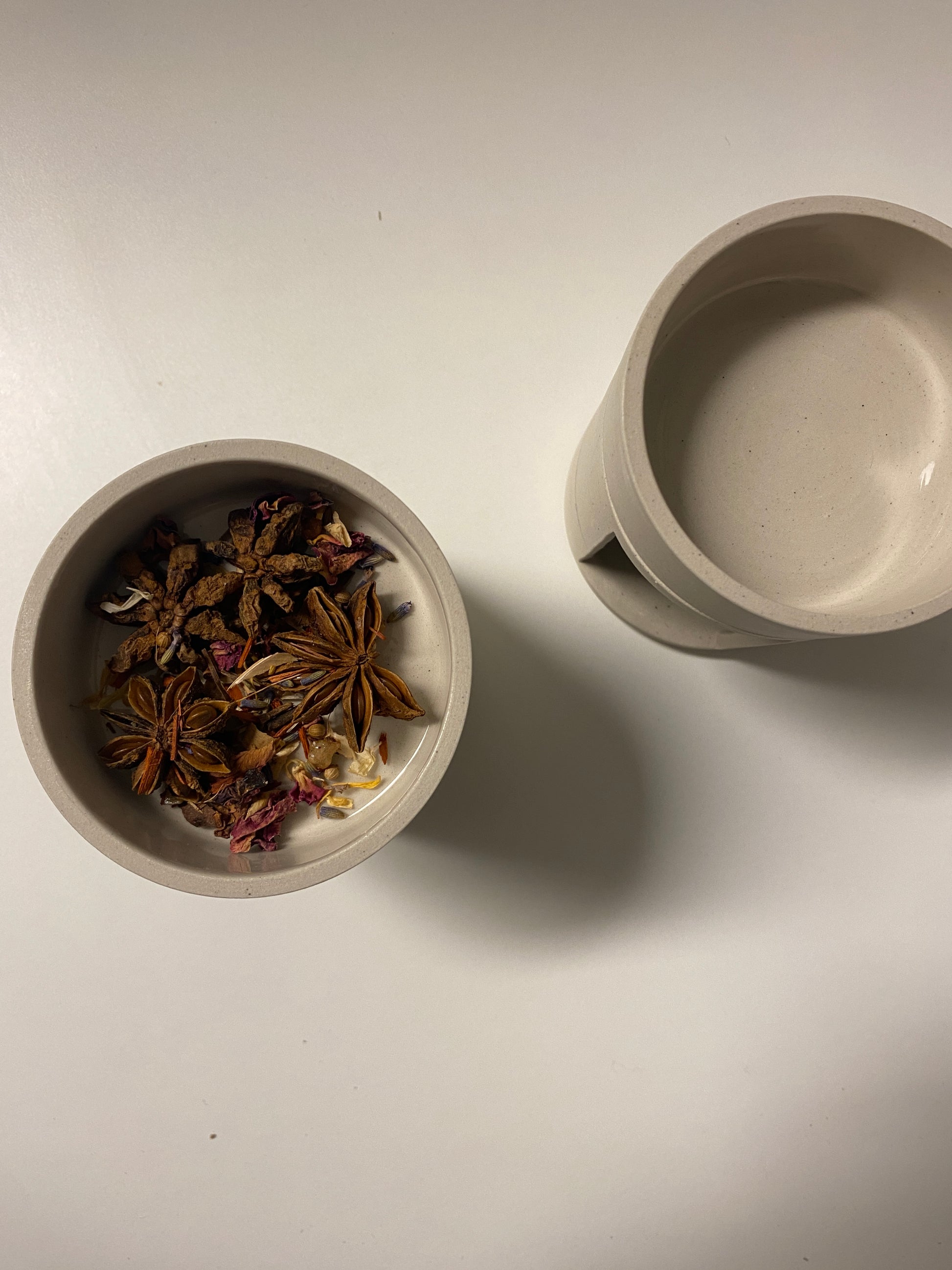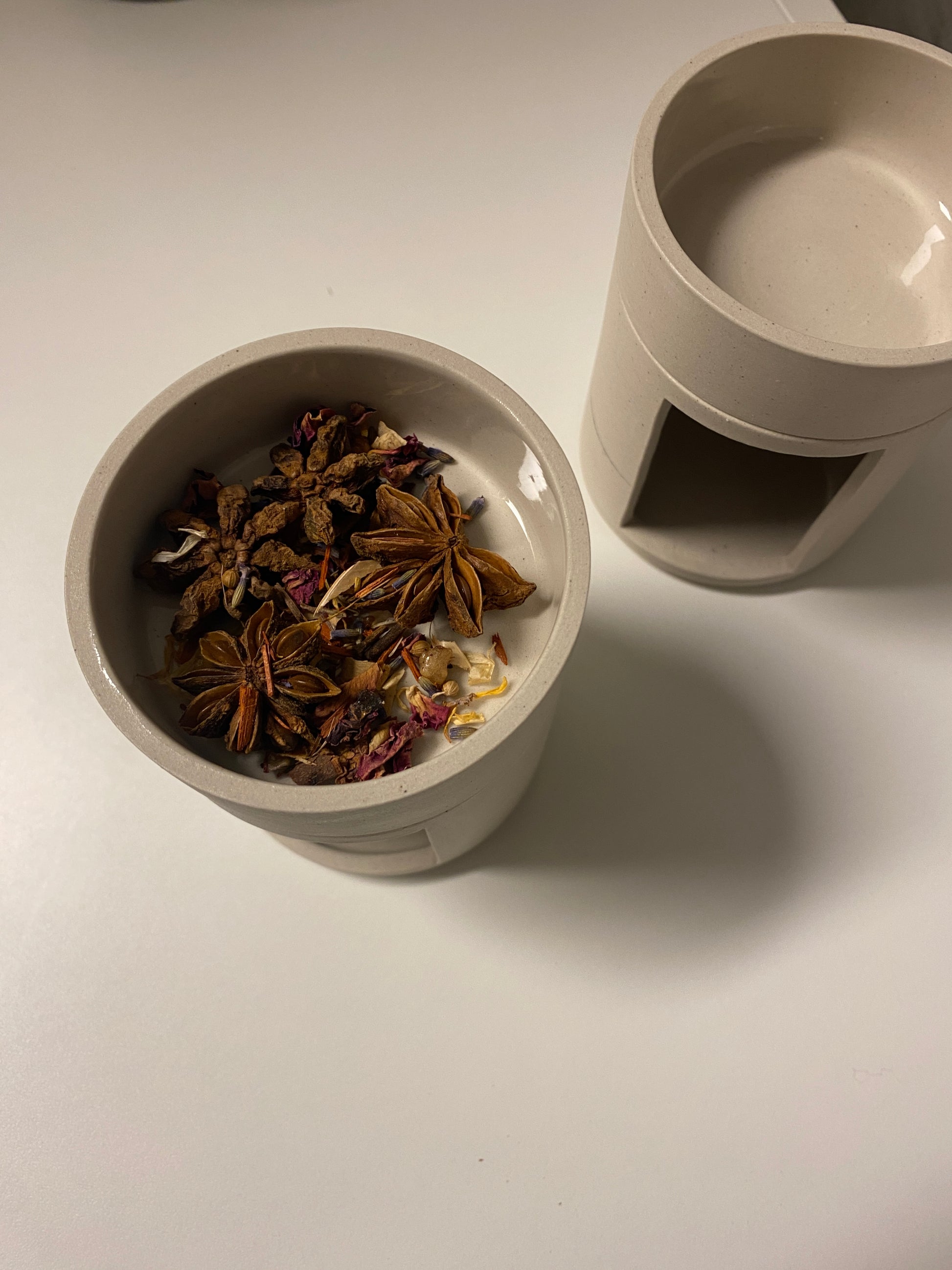 Perfect for incense or oil. Finished with a matte exterior and a clear glazed interior.